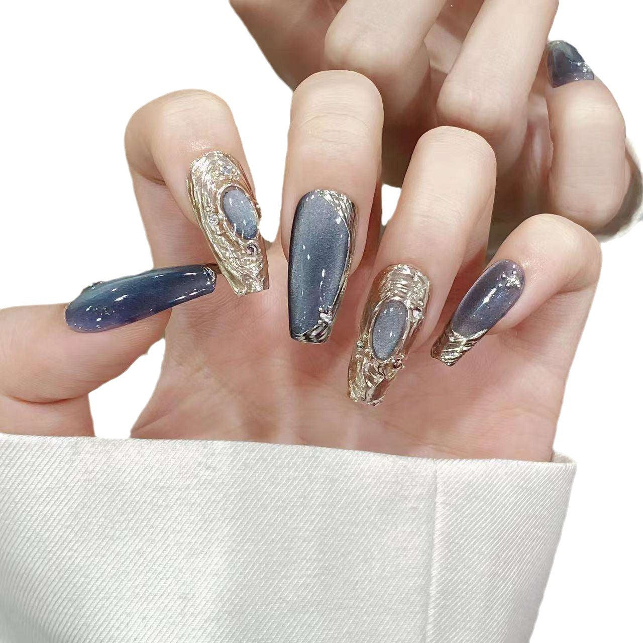 “These nails are absolutely breathtaking! The metallic swirl details paired with the shimmering blue-gray hue look even more stunning in person than in the photos. The craftsmanship is incredible—they feel sturdy, and the fit was perfect for my nails. I’ve gotten so many compliments since wearing them. 10/10 would buy again!”